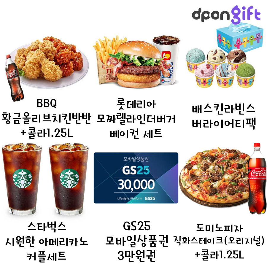 커피 쿠폰, 모바일 상품권, 편의점 금액권, 치킨/피자 쿠폰, 문화상품권 등